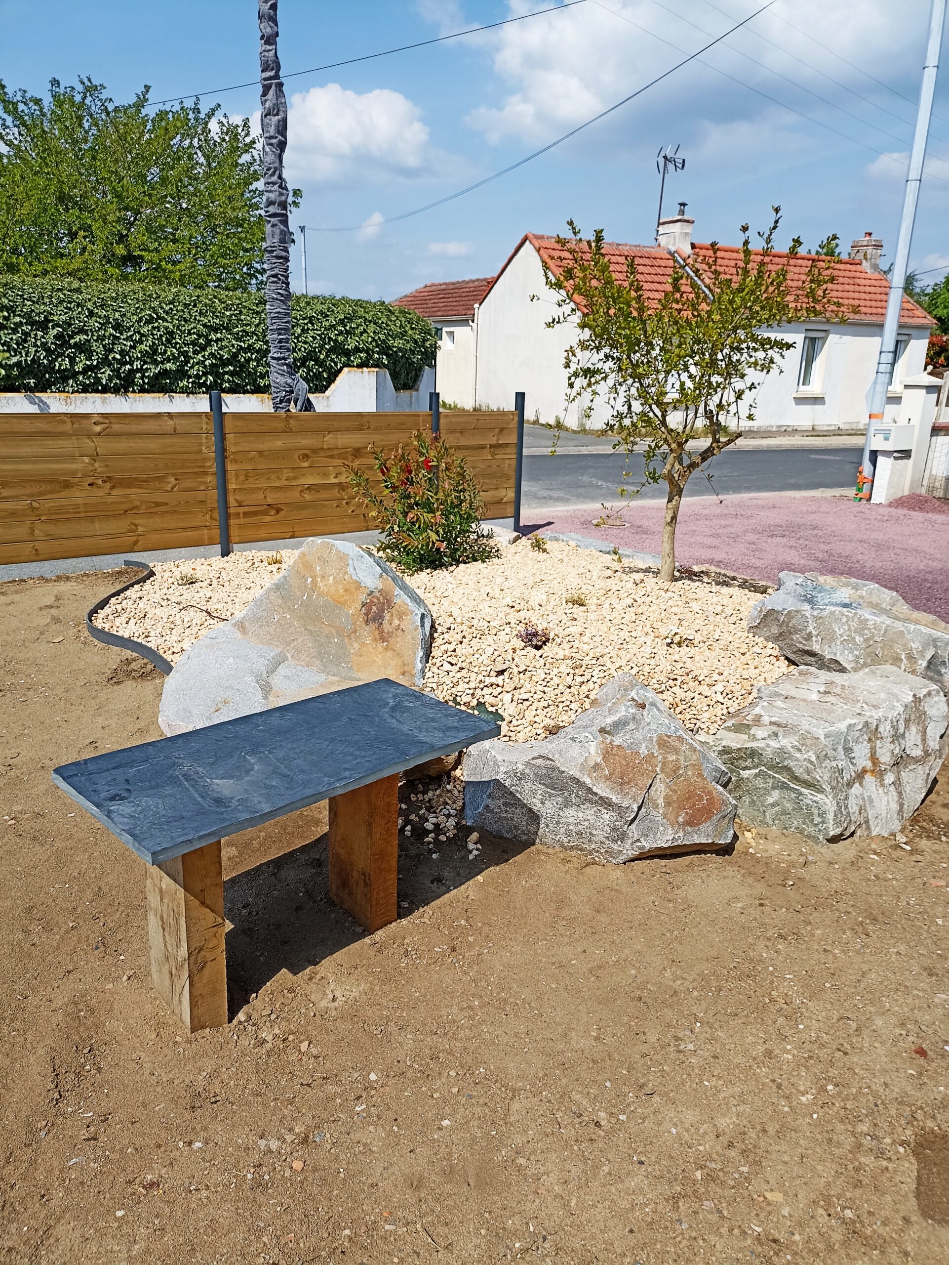 Pose de cloture, réseau EP, Massif avec enrochement, cloture, parking en nidagravel, allée en plaques d’ardoise, engazonage, création d’un terrain de pétanque…