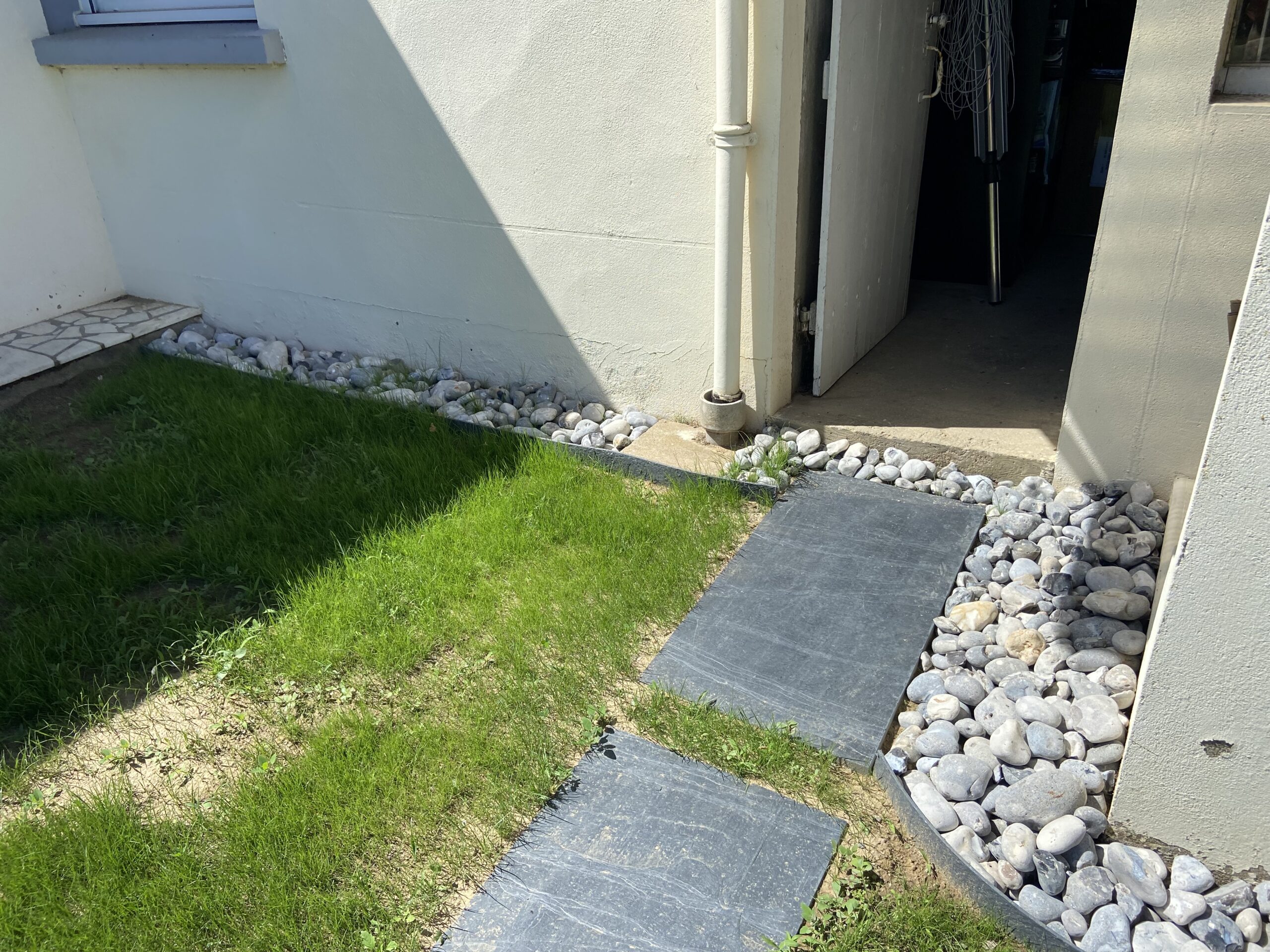 Une allée en pavage, graviers ou ardoises