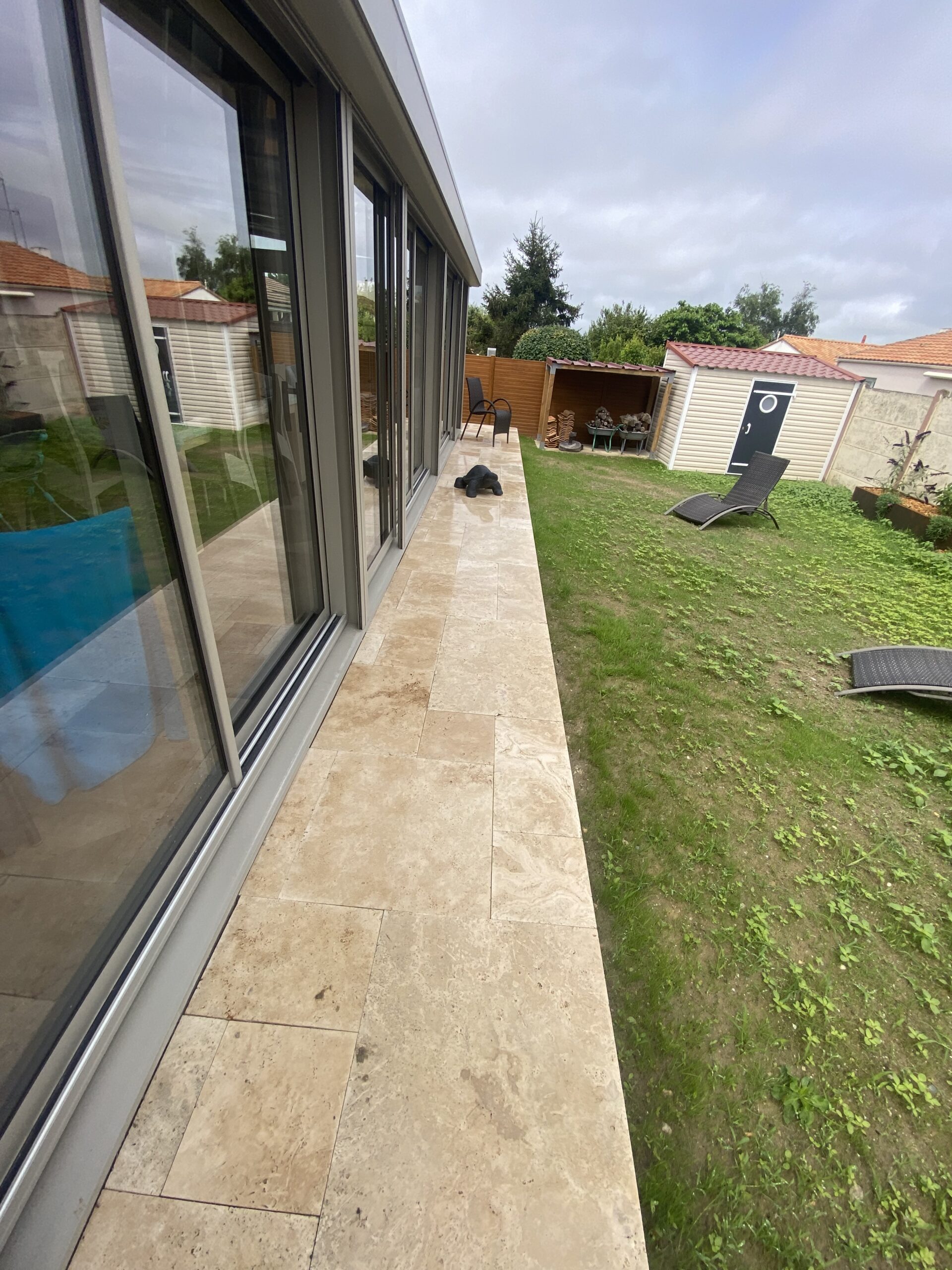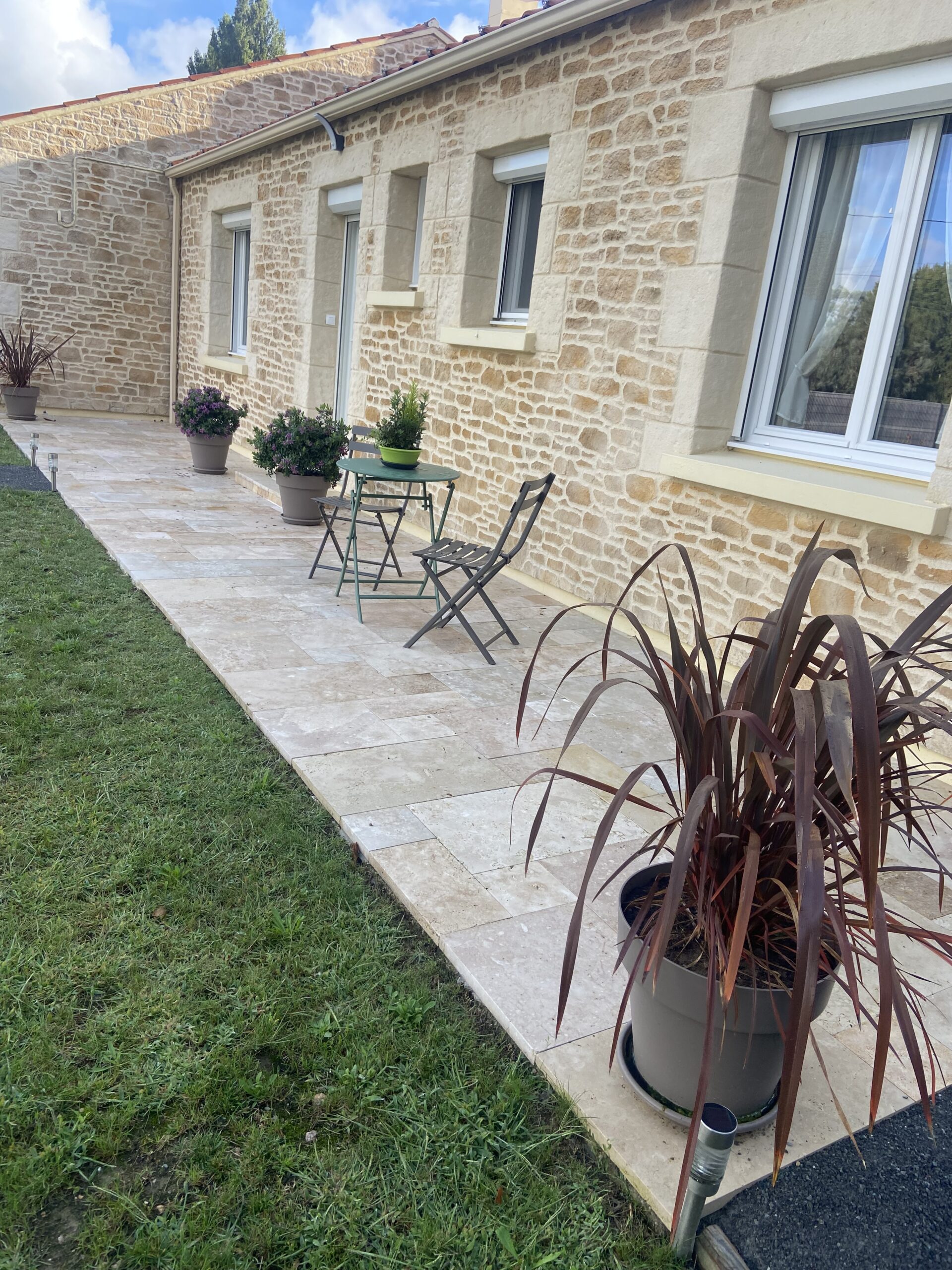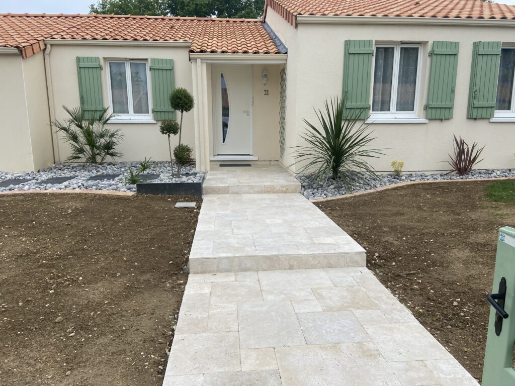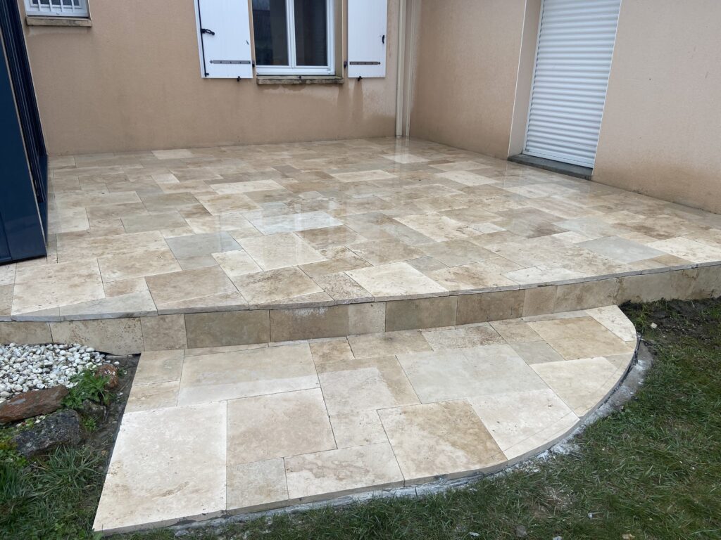 St Philbert de Bouaine - Dallage multi formats travertin beige avec contre marche