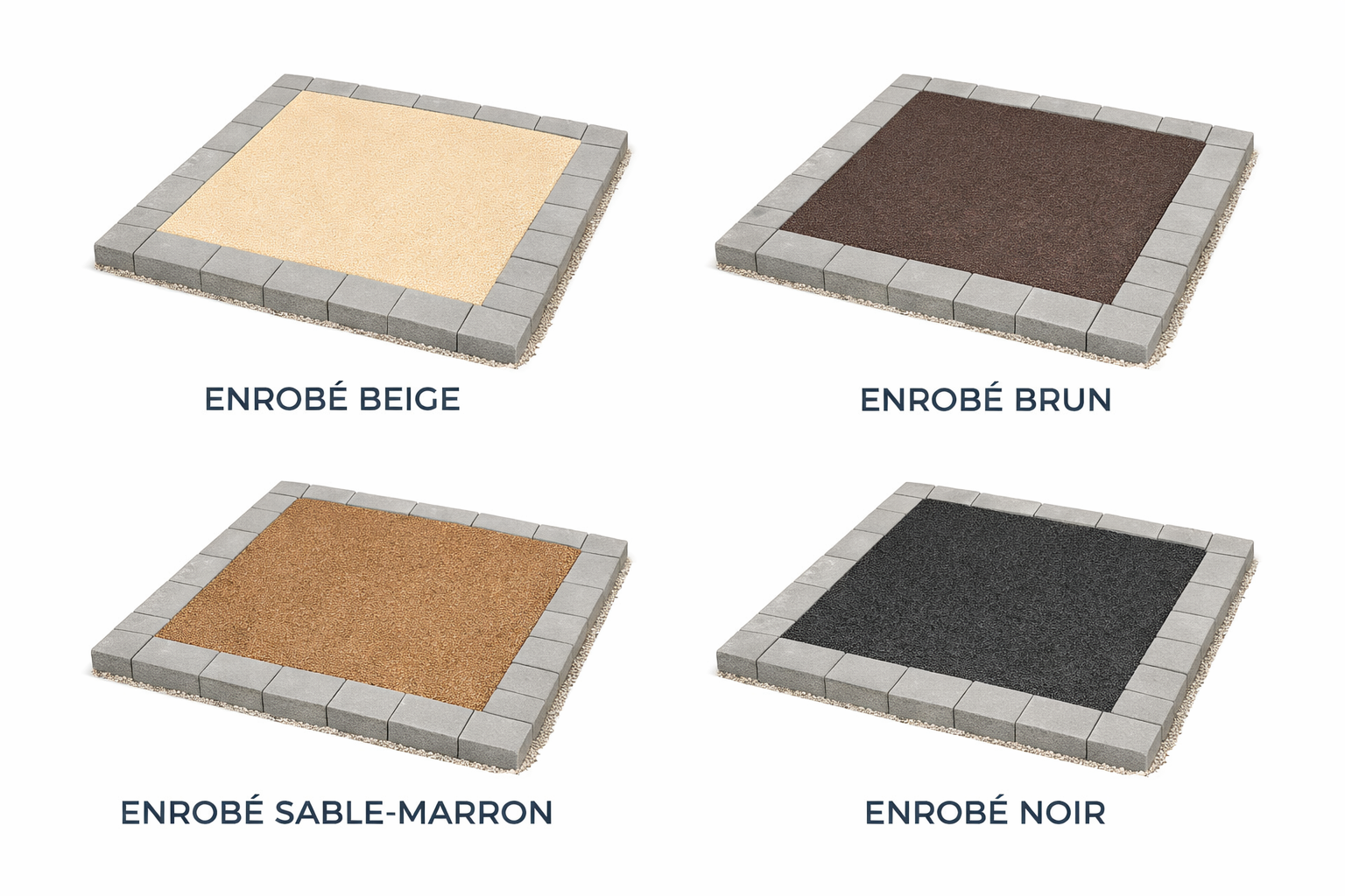 Ci-dessous quelques-unes de nos réalisations avec les 4 couleurs d’enrobés que nous proposons (brun, noir, sable-marron et beige) :